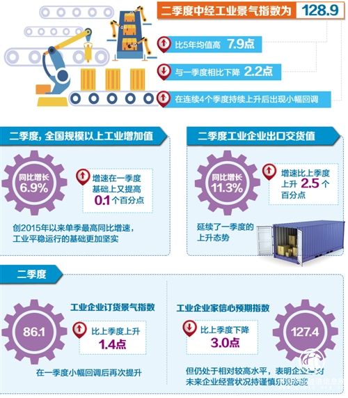 二季度,工业企业订货景气指数为86.1,比上季度上升1.4点,在一季度小幅回调后再次提升;工业企业家信心预期指数为127.4,比上季度下降3.0点,但仍处于相对较高水平,表明企业家对未来企业经营状况持谨慎乐观态度。综合来看,在相关政策的支持下,三季度工业有望继续保持平稳态势。(本文执笔:吴滨王宏伟)
