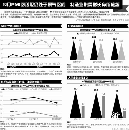 统计局数据显示,2017年10月制造业PMI为51.6%,比上个月下降0.8个百分点,但高于去年同期0.4个百分点。